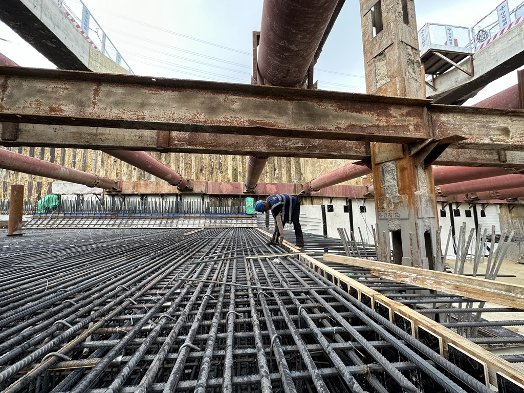 盛夏末伏,记者走进江阴靖江长江隧道工程建设施工现场,感受隧道建设者们与高温“较劲”,与时间赛跑,全力以赴推进项目建设进度的生动实践。 8月16日上午9点,天空阴郁闷热。走进江阴靖江长江隧道江南主体工程一区第六结构段施工现场,当下施工的是明挖隧道光过渡段,施工基坑位于地下10余米。在江南明挖段隧道工地,约400名工人正抢抓上午的黄金时间进行施工。