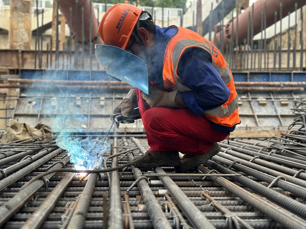 上午10点,电焊工李宏宽蹲在距地面1米多高的钢筋笼上,一手举着防护面罩,一手拿着焊枪,瞬间一朵朵焊花从焊枪口飞溅而出。李宏宽所在的作业面,由横竖交织的钢筋构成一个个空格,稍有不慎就有可能踩空,腿脚被钢筋毛刺擦伤。而李宏宽前后腾挪,如履平地,耀眼的弧光不断闪烁,隔着1米远,都能感到一股热浪扑面而来。 上有阳光直晒,下有钢筋笼蒸腾,蹲在低洼处一会儿就汗如雨下,但李宏宽必须把自己裹得严严实实。“溅出的火花、焊渣温度很高,稍不注意就会被烫伤。”满脸通红的李宏宽解释说。可即便如此,李宏宽的外套上已经有十多个被焊花烫穿的小黑洞……“焊一会休息一会。”李宏宽一边利用作业间隙擦拭汗水,一边说。 为了保证高温作业的一线工人身体健康和安全,项目部加强了防暑降温物资储备,为建设工人们准备了绿豆汤、人丹、藿香正气水、盐汽水等防暑降温用品,并通过错峰防暑作业或轮班作业的方式,加大对施工作业人员的保护力度,避免高温暴晒、疲劳作业,确保施工生产安全。“我参加过很多工程建设,但这么长的穿江隧道还是第一次。很自豪,稍微休息一会‘充充电’就能继续干了。”李宏宽笑着说。 虽然天气很热,但江阴靖江长江隧道各项工程建设都在如期推进。江阴靖江长江隧道全线采用双向六车道高速公路建设标准,设计行车速度80公里每小时。隧道建成后将成为长江流域首条高速公路过江隧道,并可有效分流靖江与江阴之间的城际交通需求,缓解江阴大桥通行压力,对加快构建交通运输现代化示范区,更高水平推动长江经济带建设和长三角一体化发展具有标杆价值。 |