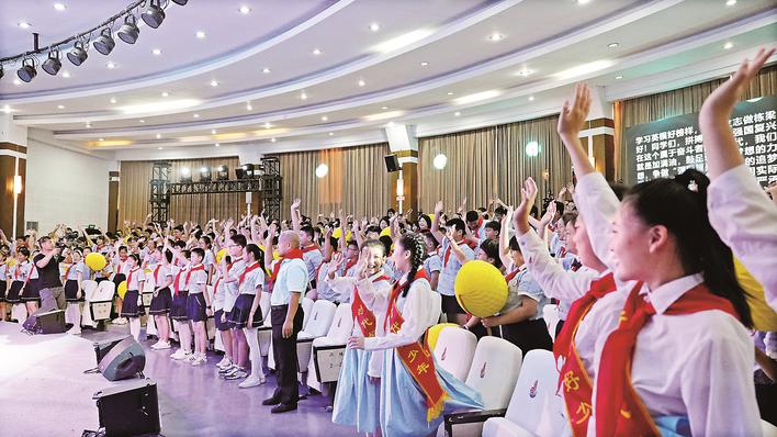 活动现场,全国农业农村劳动模范费琳琳带领同学们走进第二课堂《织梦农场》,让孩子们体验汗水和劳动的收获,展望现代化农业背景下,乡村振兴的美好前景。 新时代是追梦者的时代,也是广大青少年成就梦想的时代。“我的梦想是成为人民解放军,在人民需要的时候挺身而出;我的梦想是当一名语文老师,让更多的孩子爱上阅读,感受中华文化的独特魅力;我的梦想是成为一名军事科学家,为祖国研究导弹,让祖国更加强大……”第三篇章《一封梦想的信笺》,孩子们纷纷畅谈自己的梦想,立志从小学先锋,长大做先锋,努力成长为能够担当民族复兴大任的时代新人。 “童心逐梦向未来,泰州少年心向党……”在情景朗诵《少年心向党》中,现场所有学生共同宣誓:泰州少年心向党,谆谆教导永不忘;学习英模好榜样,勤奋刻苦树理想;砥砺品格讲文明,全面发展圆梦想;泰州少年心向党,从小立志做栋梁! |