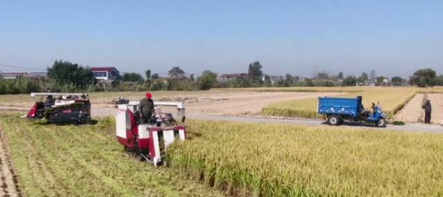 在姜堰区娄庄镇宝成家庭种植农场的麦田里,农机手熟练地操作着收割机在金色的田野里来回穿梭,一串串饱满的稻穗卷入收割机中,接着一粒粒稻子被收割机尽收“囊中”,切碎的秸秆从机尾排出,阵阵稻香也在空气中弥漫开来。不一会儿,装满稻子的收割机驶到了田埂边,村民们驾驶着拖拉机将稻子送到稻场。 在姜堰区三水街道井贤农场,大型收割机来回穿梭,发出隆隆的轰鸣声,将沉甸甸的稻穗揽入“怀中”,转眼间变成金灿灿的稻谷,田间一幅喜人的秋收图景。收回的稻子随即被转移到运输拖拉机上,直接运送至稻米烘干基地。烘干后,农户们忙着装袋、称重。今年的水稻喜获丰收,农场主姜井贤的喜悦之情溢于言表。 过去种植水稻大多靠人力和畜力,农民从种到收、从春到秋忙个不停。现今,科技进步、时代发展,农业机械化水平不断提高,机械化收割既提高效率,又节约了成本,农民种地越来越轻松。 田间一派丰收景象,秋粮收购也刻不容缓,连日来,姜堰区地方储备粮管理有限公司抢抓时间,周密部署,通过“早谋划、早研判、早应对”, 确保收获的粮食颗粒归仓、储存安全。此外,该公司还开放了粮库的部分场地,供农户们晾晒稻谷,暖心举措缓解了农户晒谷难题。 据了解,姜堰区今年的水稻种植面积43.66万亩,预计11月8日基本收割结束,全区产量比去年增产7% 以上。
