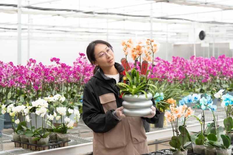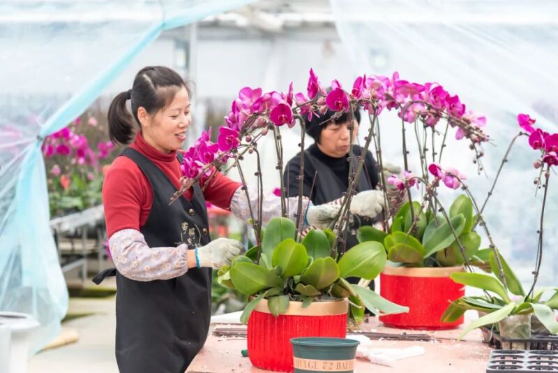 据介绍,基地平时有6名固定工人,在蝴蝶兰出货高峰期,还会从周边招收几十位村民,进行花卉包装、搬运工作,每人每月能获得几千元收入。 家住杨庄的周树凤原先在工厂上班,来基地工作已有一年,十分满意如今的工作环境。“在这里工作环境冬暖夏凉,每天看到这些花心情也愉悦。” 花香自有蝶飞来 蝴蝶兰作为节日花卉之一,每逢节庆都会迎来热销,张莹也正紧锣密鼓地为蝴蝶兰上市销售做好准备。“这段时间正是蝴蝶兰开花期,一点都不能马虎。目前,我们销售已经全面开始了,年宵模式已经打开。”张莹认准一个理:只要蝴蝶兰品种多、质量好、花量大,自然不愁销路。 她结合市场需求采取“线上+线下”的模式拓宽蝴蝶兰销路,泰州海陵的蝴蝶兰插上“翅膀”从罡杨镇飞向“五湖四海”。目前,他们已向如皋、常州两大批发市场进行直销,在常州设立了总经销商,还通过抖音平台带货,尽最大努力扩大销量。