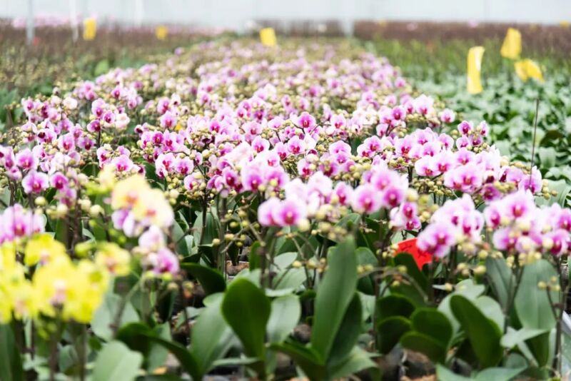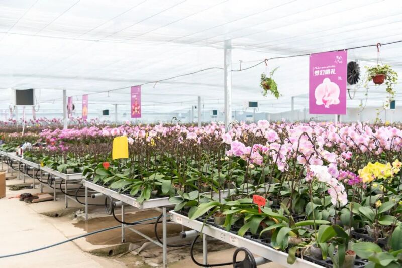 蝴蝶兰本是热带植物,对于生长环境要求极高,它喜高温、高湿,又忌闷热、通风不良,对温度十分敏感,生性挑剔的它如何适应江苏泰州的环境? 张莹为我们解开疑惑:除了原生环境,只有智能化温室里才能养出蝴蝶兰。大棚用的是荷兰进口的普瑞瓦花卉种植管理系统,所有的温度和湿度可以通过手机进行控制,白天温度控制在25℃左右,夜间控制在18-20℃之间。 “在基地智能大棚的调控下,不仅蝴蝶兰的成活率显著提高,人工成本也大大降低,品质更是上了一层楼。”张莹说。 技术在国内排前三 张莹介绍,蝴蝶兰基地从2022年8月开始种植,一期占地5500平方米,二期占地3800多平方米,现有成品蝴蝶兰16万株,主要有大辣椒、宝贝、黄格格等113个品种。 除了常见的品种,在大棚的二期还有颜色清新自然的马卡龙色系蝴蝶兰。“这些都是用了活体染色技术,在不影响花期的情况下,让蝴蝶兰变成五颜六色,填补了蝴蝶兰花色的空缺。这项技术,我们在国内能排前三。”张莹骄傲地说,“纵使价格比其他品种高一些,但是色彩艳丽、款式新奇,颇受年轻人喜爱。”
