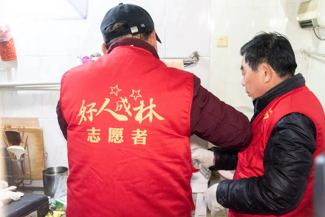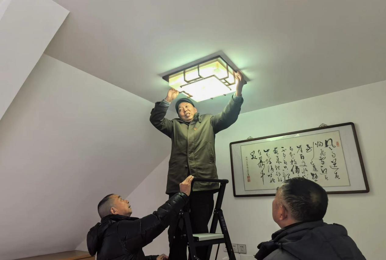段成林简单查看吊灯,发现线路没问题,是灯年久老化。 我给你换个新的吧,LED 越用越亮。仅用10分钟,新灯安装完毕,开关一按,家里瞬间亮堂了。 “谢谢段师傅和这个团队,每次一喊就到,不但不收钱,连个水都不喝!”说着,仲春红湿了眼眶。 “喂,老段吗?我家水管在漏水,有没有空来看看?”大年三十上午,在办公室刚坐下,段成林就接到了居民王跃群的电话。拿着工具包,段成林和几名同伴立刻出了门,经过检查,发现是水管冻裂了,段成林又连忙回服务站拿来了材料。“水管、电灯这些基本材料我们日常都备在志愿站,这样可以随时拿。” 忙活了一上午,中午回到服务站,几人就拿泡面对付了一下。“年三十是最忙时候,我们虽然苦一点,但看到群众露出笑脸,值得!” 过年期间,每天段成林团队都要前往五六户居民家中维修水电,他们坚持分文不收。 从一个人到一群人,让好人“成林” 一个人的力量毕竟有限,这些年,在段成林带动下,傅群声、潘德宝、戴炜、王建明、丁文贤、顾红珍、申粉居、骆步琪等20多名有技能的志愿者纷纷加入志愿服务站,为周边居民提供服务,受到居民的好评。