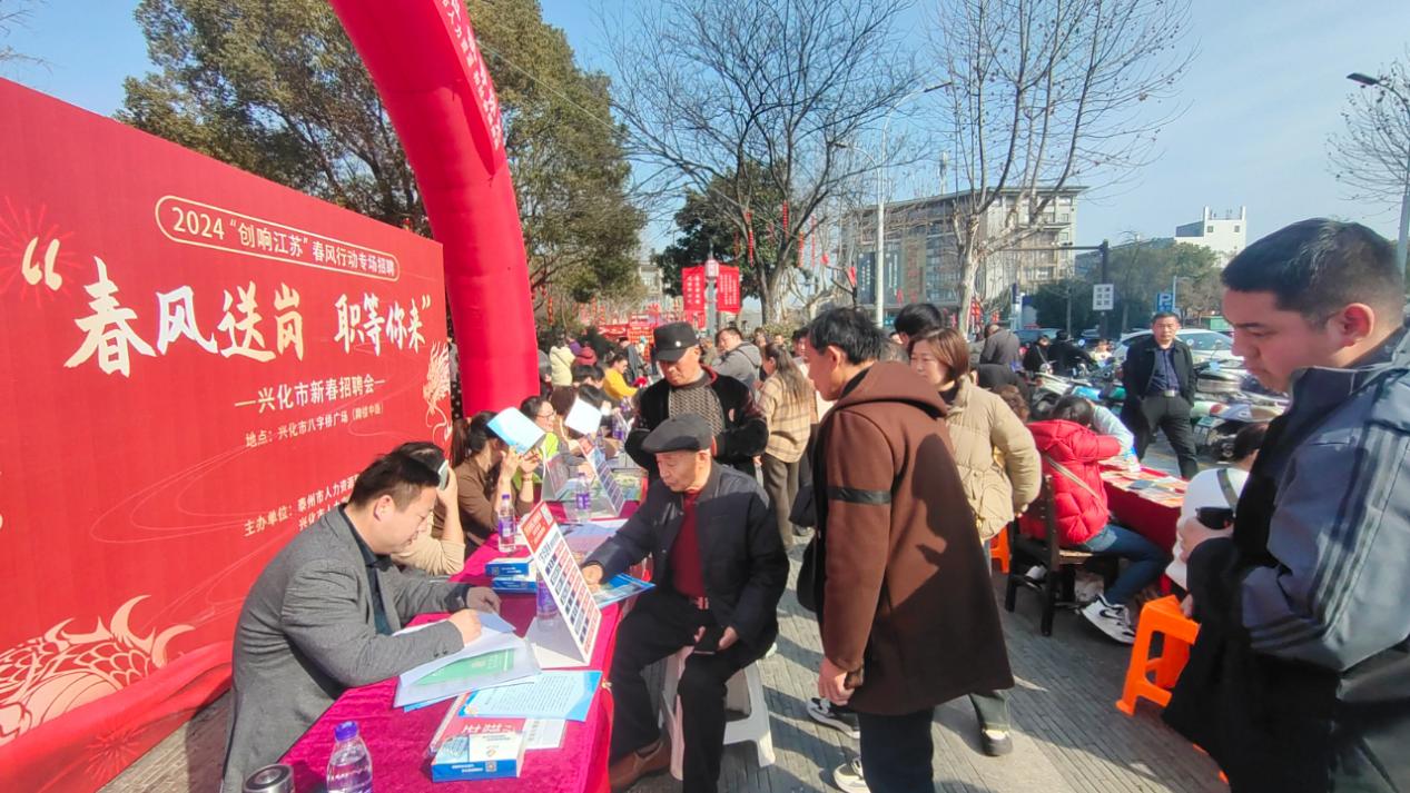 2月14日大年初五下午,在兴化市八字桥文旅休闲街区萦绕,一场“春风送岗 职等你来”新春招聘会“就业大集”专场活动在火热进行。安井食品、东华链条等用人单位展台一字排开,咨询者络绎不绝。