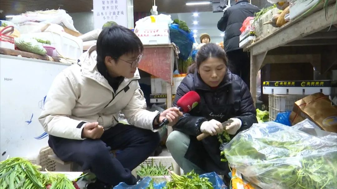 说到春节,中国人爱在新年餐桌上,用美食犒劳一年的辛劳。采购食材,准备美食,春节期间的菜场格外忙碌,处处透露着节日味、生活味、人情味,浓浓的烟火气,浓浓的年味儿,交织出市井百姓幸福生活的美丽画卷,而起笔作画绘就这一切的,则是菜场里的商户们。春节期间,记者走进兴化市的农贸市场,走近蔬菜商贩,聆听他们创业过程中的酸甜苦辣,品味他们的百味人生。 采访中,我们先来到五里亭农贸市场,这里人来人往,新鲜的蔬菜、瓜果等农产品琳琅满目,商贩们热火朝天地叫卖着,顾客们在市场里挑选着中意的食材,商贩们也是铆足了干劲,忙中作乐,用自己的双手创造自己的幸福生活。