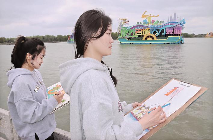 南京理工大学泰州科技学院4名大学生相约来溱湖写生,恰遇贡船巡游,他们情不自禁拿起画笔专心创作。大学生王雪纯画的“活力姜堰”贡船,再现溱湖“千舟齐发,万篙激浪”胜景,画作还穿插了麋鹿灵动奔跑的身影,彰显蓬勃生机活力。王雪纯来自无锡,现在读大三,学的数字媒体艺术专业,此前曾来过溱湖,感受了原生态湿地美景,但这是第一次近距离看到美轮美奂的贡船。“我将发挥专业特长,画出精彩壮观的会船盛景,吸引更多游客来溱湖打卡。”王雪纯说。 9岁的俞清淼第一次看到贡船特别兴奋,不停地用电话手表拍下眼前的美丽画面。 “今天我来溱湖玩,看到湖面上接二连三的贡船,上面有喜鹊、麋鹿、飞龙,还有凤凰,感觉走进了多彩浪漫的童话世界。”俞清淼说,回家后,他要写一篇日记,还要动员更多同学来溱湖看船赏景。 “都说‘溱潼会船’没户口,过了开幕式就会走。今年的贡船巡游和篙船比赛改变了这样的惯例。”市民丁桂兰说,会船延长时间,精彩不间断,快乐不打烊,满足了全民共享会船民俗的乐趣,也助推旅游热不断升温。 溱湖文旅集团副总经理顾宇鸣介绍,今年,姜堰区精心打造“龙兴姜城”“龙行龘龘”“活力姜堰”等8条气势恢宏的主题贡船,通过民族化、艺术化、形象化的丰富造型,展现中华民族精神图腾“龙”文化,充分彰显姜堰经济建设、社会发展、文化旅游、生态文明等方面的崭新风貌。会船季期间,每逢双休日,溱湖景区都将组织贡船巡游和篙船比赛,活动持续至5月。 |