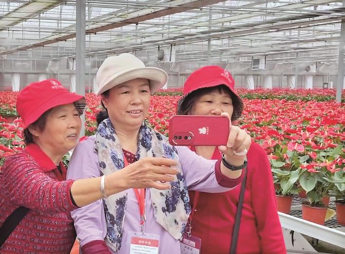 “dai ga hou……”游客一出站,14位地接导游就用广东话热情欢迎他们,带领大家有序前往景区。游客们首先来到全国首家以花文化为主题的花栖云里花文化·现代园艺展示馆。一进展示馆,映入眼帘的便是国色天香牡丹、泰州市花梅花、展馆馆花红掌的动态影像,随着影像变化,现场的万花筒艺术装置使得游客仿佛坠入五彩斑斓的繁花梦境。随后,游客们来到花卉产业示范区大棚,一下子被眼前数十万株红掌花海所震撼,“哇,这么多红掌,真是花海一般,实在太美了!”大家啧啧称赞的同时,或拍照或录像。游客们还依次游览了千载流芳、花艺风雅、游园意趣等六大花文化展区,感受现场世外桃源般的闲趣和雅致。