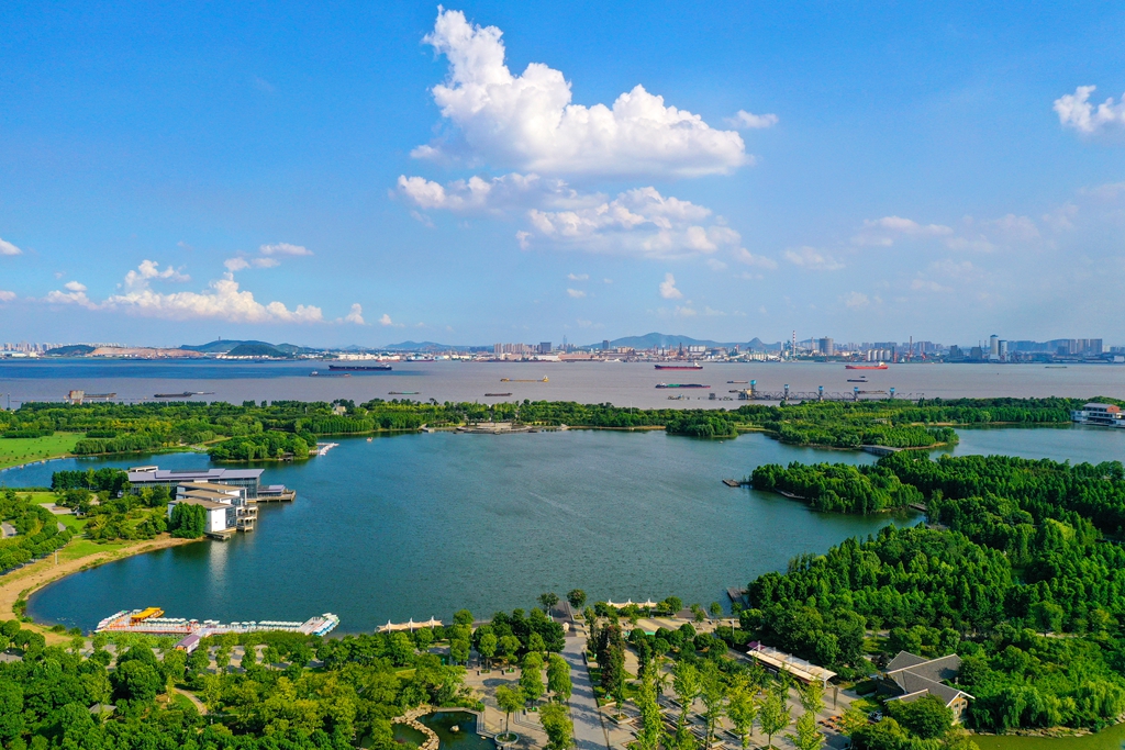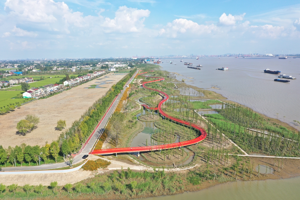 4月1日下午,一艘装载着4.8万吨煤炭的海轮靠泊深国际港口江苏靖江港码头,成为该码头自去年12月开港运营以来,靠泊的第19艘海轮。深国际智慧物流中心项目致力于绿色化、智能化港口建设,全封闭干煤棚的运用开创了长江岸线港口物流企业的先河。 靖江将以深国际智慧物流港区为示范引领,推动传统码头往数智化方向转型,打造长三角一流的智慧港口、绿色港口。同时,主动对接上海港、宁波港、太仓港,打造大宗商品集散交易、江海联运国际物流等枢纽中心,真正将大进大出的港口“流量”转变成为我所用的经济“增量”。 渡江战役期间,驻扎在新桥镇的三野23军69师207团第一、第三先锋突击营1000余人,凭借靖江人民创造的“半帆待命”战术,仅用16分钟就渡过了长江,被誉为“渡江先锋突击团”。 “半帆待命”彰显了靖江人敢为人先、破旧立新的勇气。正是这种勇气的传承,新桥镇渔忆湿地生态公园应运而生。原先,这里是杂乱不堪的码头、工厂和鱼塘。2018年开始,靖江启动退渔还湿工程,并对江滩实施生态修复。如今,这里已经成为靖江市民休闲观光的好去处。