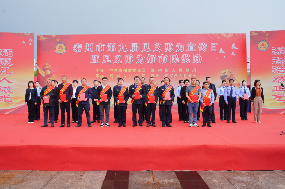 5月6日,泰州市开展第九届见义勇为宣传日暨见义勇为好市民奖励活动,对2023年4月1日至2024年4月1日期间,泰州市范围内涌现的见义勇为先进人物进行奖励。