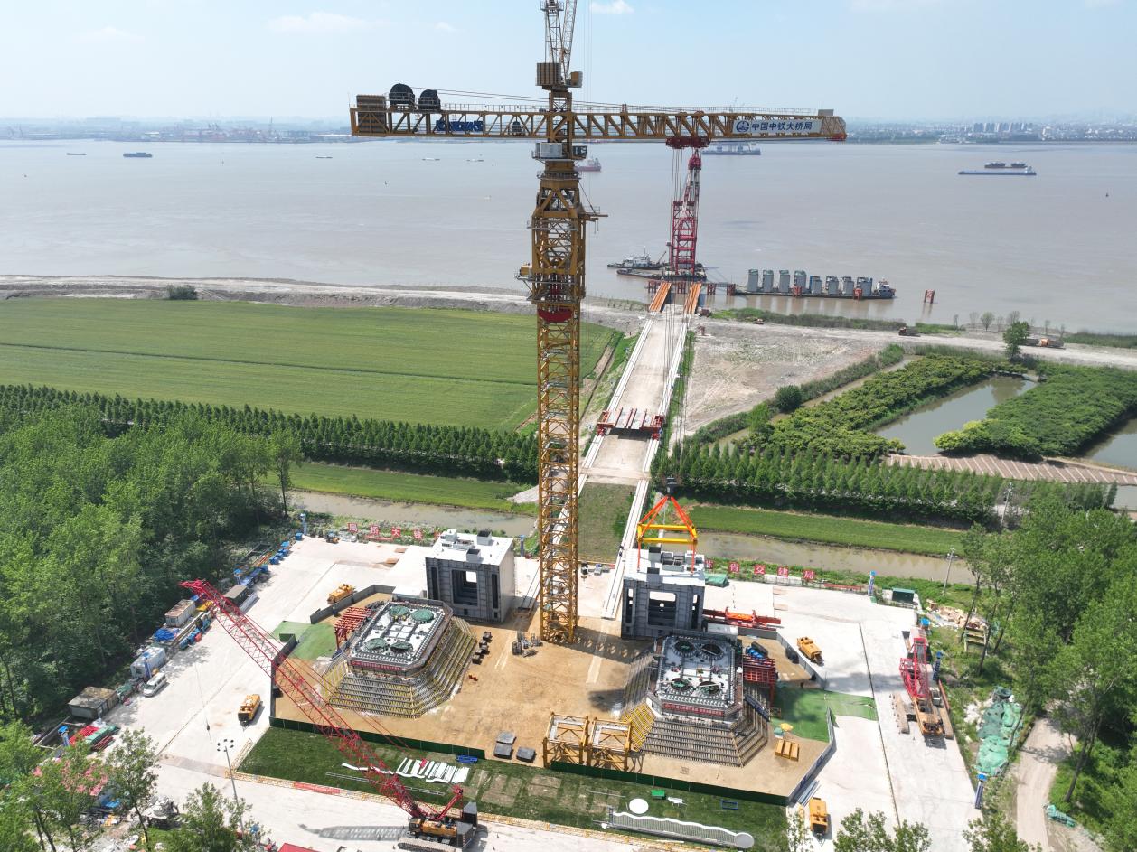 世界最大塔式起重机在靖江“登岛”安装,张靖皋长江大桥南航道桥北主塔进入“堆高”新阶段