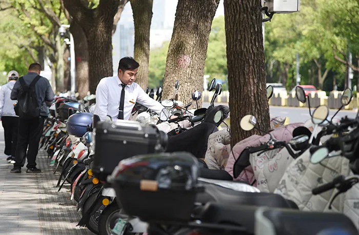 “来,这边有地方停。”看到有人在找停车位,金鹰物业安保队长顾健毫走上前去,帮忙指引。从鼓楼路到东进路,他们每天安排了三个人负责管控车辆。“车辆停放整齐也能够提升商场的购物体验,吸引更多的顾客前来购物。”顾健毫说。 过去的“单打独斗”变成了现在的“握指成拳”,这样的改变得益于海陵区推出的“城管+街区”模式。针对东进路非机动车停车秩序问题,海陵区融合城管、交警、社区、商家、志愿者等主体力量,落实市容环卫责任制,定期进行监督检查。 “我们外卖车辆有了专属停车位,以后再也不用为了找停车位而发愁了。”外卖小哥赵时开心地说。坡子街餐饮商铺多,日均出单量较大,许多外卖骑手在路边临时停车等单、接单,外卖车辆乱停乱放一直被市民所诟病。海陵区组建暖“新”共建联盟,在不影响行人通行、保障道路畅通的前提下,施划外卖专用停车位7处,有效缓解了这个问题。