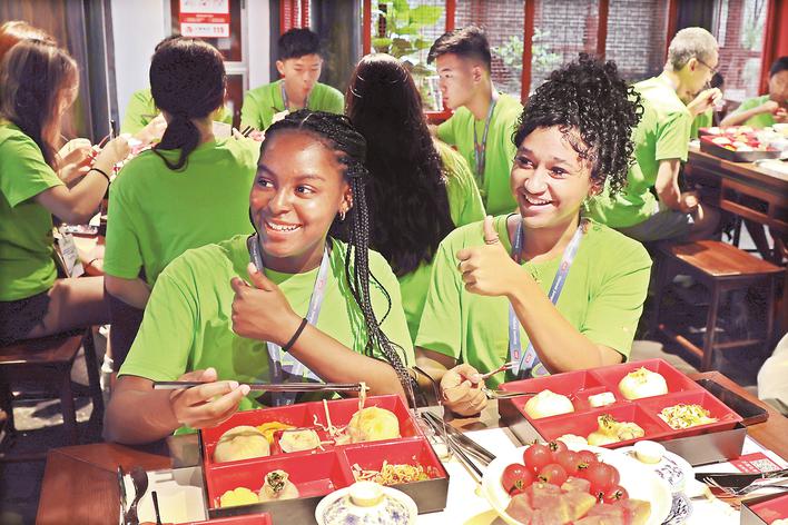 “还行,不难学。”美国学生Michael Zhang说,之前在家里吃过饺子,这却是第一次自己动手包饺子。 包饺子要用筷子挑馅料,很多学生对筷子“无从下手”。“我还是第一次拿筷子,不会用。”美国学生Mathews Lee'Anya有点腼腆。“没事,我教你。”省泰中高二学生杨钦园手把手教起她来,“这样,用拇指、食指和中指轻轻拿住筷子,无名指垫在筷子下面,五指拢起来,把筷尖对齐,慢慢夹取食物。” Mathews Lee'Anya反复尝试,终于成功夹到饺子馅,开心得咯咯笑:“哇,好神奇!我学会了!” 来泰州自然不能错过地道的泰州早茶。23日上午,美国师生来到泰州老街桃园里餐厅,品尝传统泰州早茶。 当热气腾腾的“一茶三点一面”依次端上八仙桌,美国师生一个个“哇”地张大嘴巴,纷纷掏出手机拍摄。“这是‘泰州三宝’,烫干丝、鱼汤面、蟹黄肉包。这是马兰头烧卖、秧草包、虾仁蒸饺,又称‘日月星辰’组合。”面对香气诱人的美食,听着泰州早茶集团运营部部长黄美云的介绍,美国师生立马开动,边吃边不住竖起大拇指点赞“Good!”