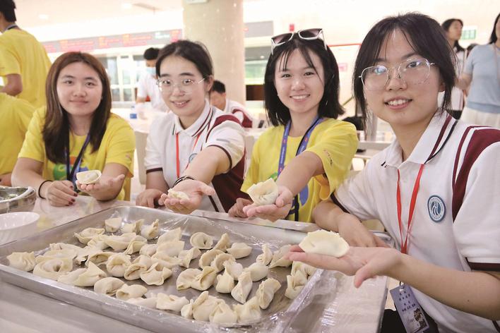 当天下午,省泰中老师董佳琪还带领中美师生一起练习八段锦。“在美国,也有很多中国武术组织,以华人为主,大家经常聚在一起练习,一些当地的美国人也会参与进来,体验中国武术的魅力。”美国带队老师Jianqing Zhang说。 中医作为我国传统文化的瑰宝,博大而精深。23日下午,美国师生相继来到扬子江龙凤堂药业集团、江苏中药科技园,感受中医中药的独特魅力。在江苏中药科技园,美国师生还观赏了清雅的茶艺展示,一同品鉴香茗。 包饺子品早茶,尝地道“泰州味” 在我国,饺子是吉祥团圆的象征,每逢新春佳节,家家户户都要吃饺子。为使美国师生“入乡随俗”,22日中午,省泰中食堂的师傅们特地准备了饺子皮和馅料,带领中美师生一起包饺子。