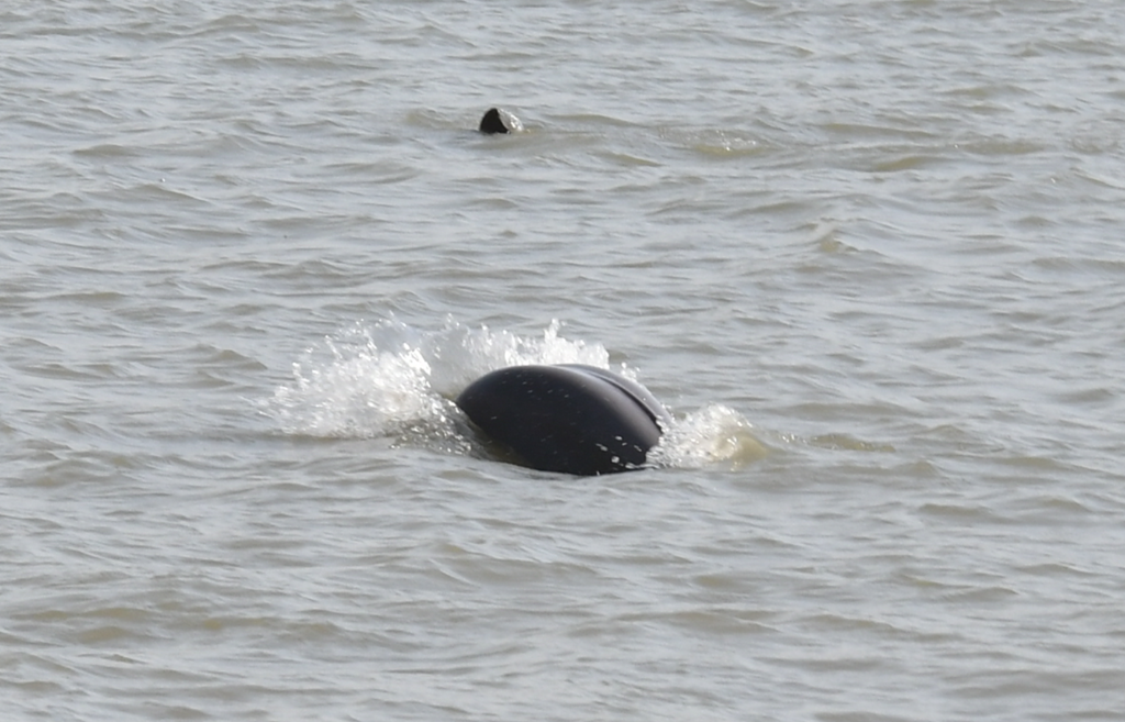 在东线第一帆纪念公园附近水域,发现“母子豚”逐浪戏水镜头