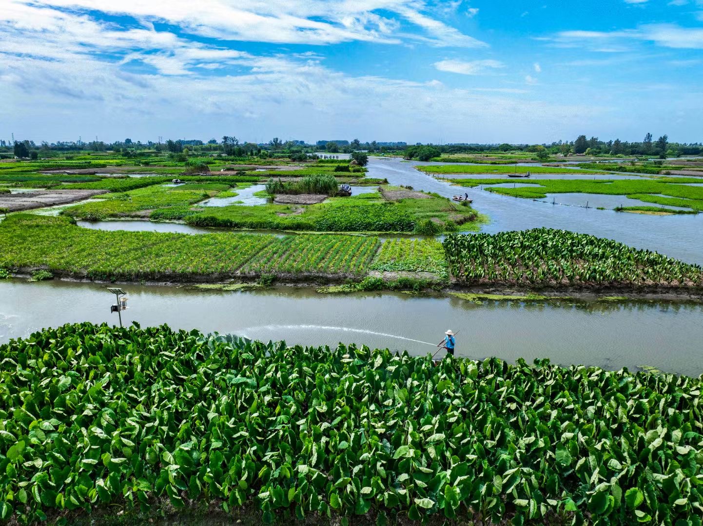 捞泥渣壅根是垛田种芋头的传统方法。后来,随着化肥的大量使用,基本不用泥渣壅根了。这些年又取泥渣壅根,是因为该市建立了垛田龙香芋种植基地,实行绿色标准种植,当地芋头现在已经成了千垛旅游的特色产品,价格也涨了不少。 登上龙香芋产业园观景塔眺望,如网的水系,分割出一块块田地,它们大小不等,形同小岛,非常壮观。这就是兴化的“垛田”奇观。 春天,垛田上的油菜花盛开,景色旖旎。立夏后,油菜花谢去,绿油油的香葱和龙香芋又成为主角…… 2014年,“兴化垛田传统农业系统”被联合国粮农组织确定为全球重要农业文化遗产。十年间,兴化坚持在发掘中保护、在利用中传承,接力续写垛田高质量发展的新故事。 十年,在发掘中保护 徐马荒湿地,一块垛田保护公示牌异常醒目。公示牌上,保护级别、保护范围、禁止行为等一一标明,垛田保护实现精细化管理。 千年前,为了抵御洪水,兴化先民们垒土成垛、垛上耕种。上世纪80年代,随着防洪设施不断完善,垛田传统防洪功能逐步弱化,当地推垛成田、放岸填沟、开沟挖塘等现象滋生。当传统农业系统与当代生产生活方式发生冲突,如何应对这一世界各处遗产地共同面临的问题?就在兴化垛田成功申遗这一年,《兴化垛田农业文化遗产保护与发展规划》制定出台。2021年3月1日,《泰州市垛田保护条例》正式实施,推动垛田永续利用。 垛田保护,首先精准划定“保护圈”。兴化市委托专业机构,对垛田保护区进行测绘,确定全市垛田保护区地块周长为88.2千米,总面积约21.62平方公里,包含垛田街道、千垛镇、沙沟镇和中堡镇等4个镇街,并沿保护区边界埋设界桩270根、竖立公示牌3个,确保垛田保护范围内执法监督有据可依。 垛田保护涉及的多个部门拧成“一股绳”。兴化市强化农业农村、检察、公安、自规、生态环境等部门的合作,针对垛田现状地貌保护、水环境治理等开展联合巡查。近三年来,当地完成5万多亩垛田综合治理。 十年来,兴化设立垛田传统农业系统保护基金,每年投入3000万元以上疏浚垛田河沟,共投入资金超13亿元实施退圩还湖工程。