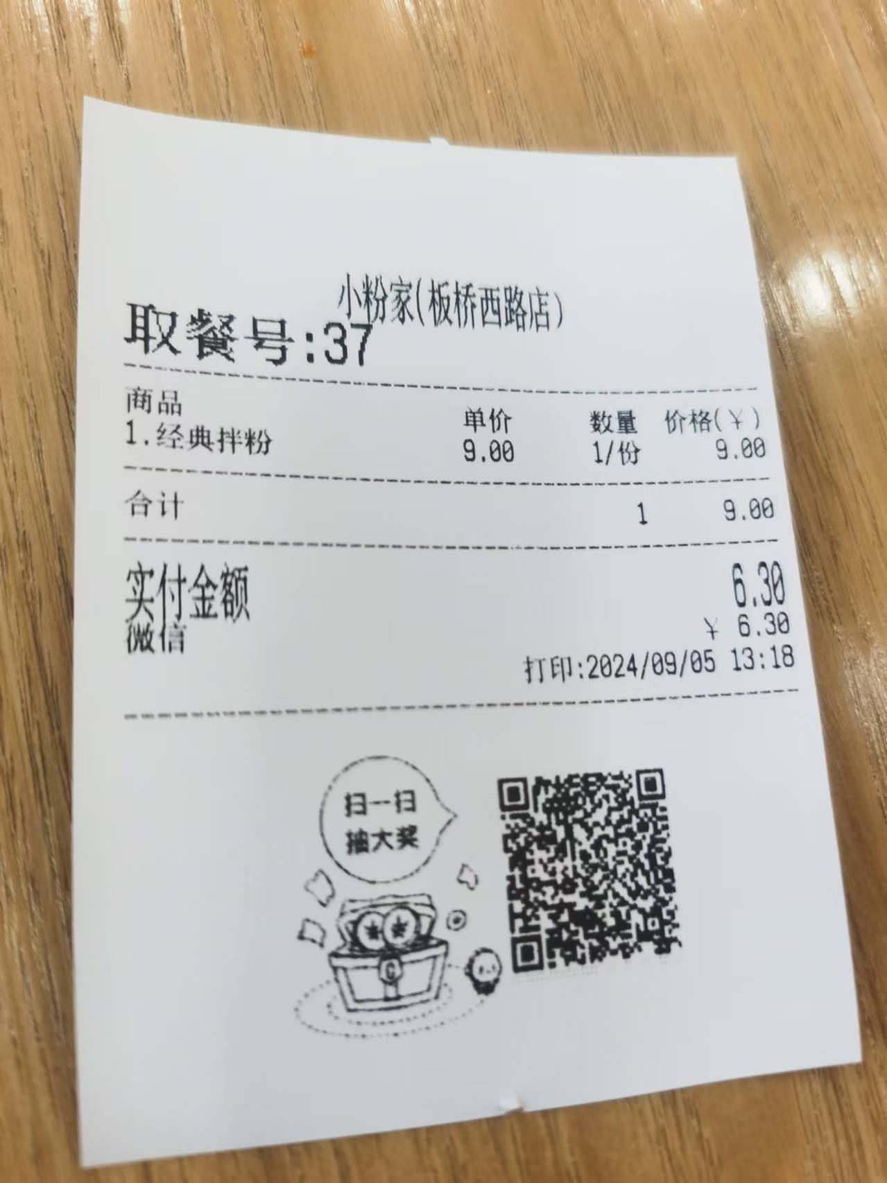 吃饭可以打折?记者半信半疑。 王晓伟照例点了一份经典拌粉,掏出手机支付。记者接过小票,上面写着“单价9元,实付6.3元”,打了七折。吃饭间隙,陆续有骑手进来就餐。