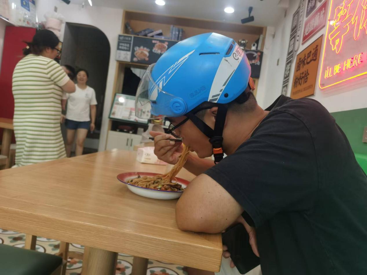 “走,吃饭去。”9月5日中午1时许,饿了么外卖骑手王晓伟骑车来到兴化市板桥西路,停在了小粉家店门口,“这里吃饭,我们外卖骑手可以打折,实惠”。