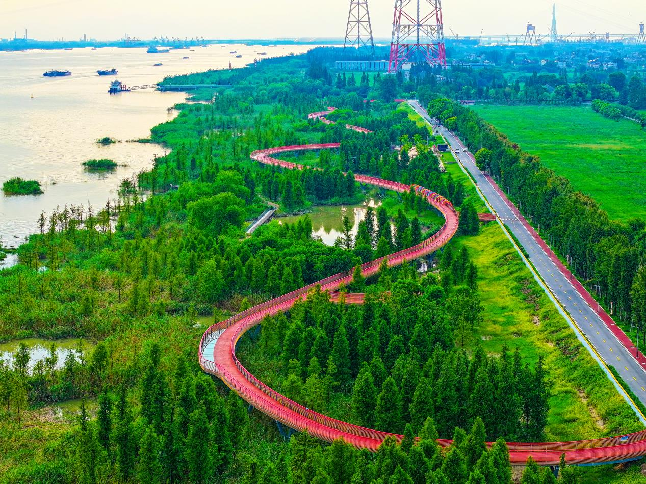 △母子豚。朱其摄 珍稀物种相继出现 在靖江能随意偶遇的珍稀物种,远不止长江江豚。 近年来,靖江市秉持“生态优先、绿色发展”的理念,把修复长江生态环境摆在重要位置,通过长江禁渔、沿江码头治理、生态湿地公园建设等措施,加快构建“九港水美、百里岸绿”的生态格局。 2021年12月,长江国家文化公园建设启动,靖江被划为核心区。该市以涵养“百里最美江岸”统揽沿江生态修复和景观提档,相继建成牧城生态园、大桥生态园、音乐花海广场、东线第一帆公园、渔忆长江湿地公园等标志性工程,连片6.4公里、近4000亩的沿江绿色生态廊道,每年接待服务游客百万人次以上。 夕阳西下,新桥镇新合村的渔忆长江湿地生态公园绿意盎然,5年前,这里还分布着码头、工厂、鱼塘。靖江市在全省范围率先完成36个沿江岸线占用项目清理整治工作,累计清退沿江企业12家,腾退生产岸线7.1公里。通过岸线留白,原先江岸边的“工业锈带”已经蝶变为大江风光带。 水质变好了,天空变蓝了,越来越多的动物“做客”靖江、“恋上”靖江。 今年6月,靖江摄影爱好者王跃先在滨江新城拍摄到国家二级重点保护野生动物水雉。5月,在马洲岛上,观测团队观测到极危(CR)物种黄胸鹀。2月,23只“鸟中国宝”东方白鹳出现在马洲岛湿地,这一珍稀濒危物种在全球仅存数千只。 一城“护渔”人 长江小桥港段,编号“苏靖护鱼31902”的护渔船正在巡逻。驾船的于兴国原是渔民,长江禁捕后,响应号召,成为一名护渔员。 2019年,靖江市打响长江禁捕退捕攻坚战,帮助上岸渔民转产就业。当年底,全市1031艘渔船、4983名渔业人口全部上岸。长江靖江段比全国大多数地区提前一年完成全面禁捕。