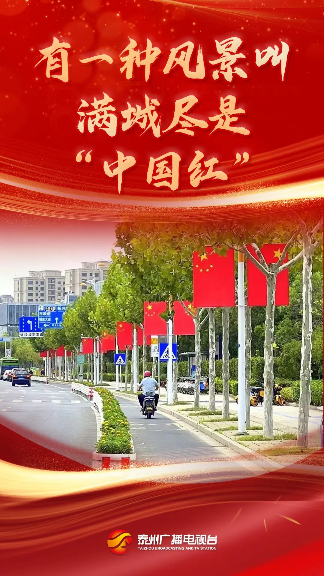 瞧! 泰州大街小巷、主次干道 一面面崭新的五星红旗迎风飘扬 喜庆祥和的节日氛围 宛如一幅绚丽的画卷