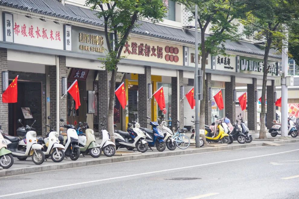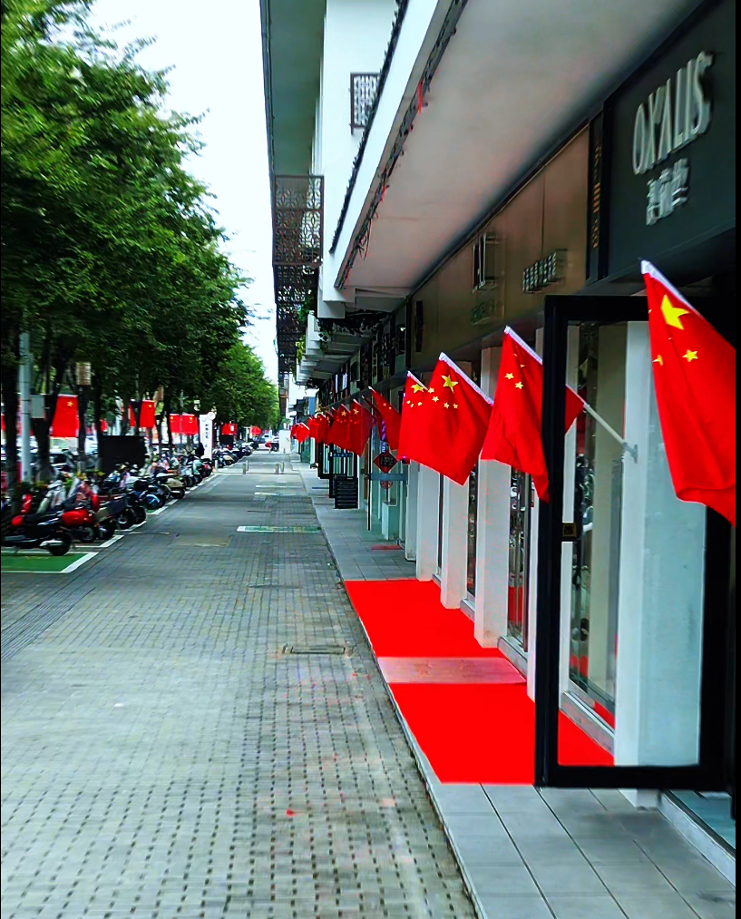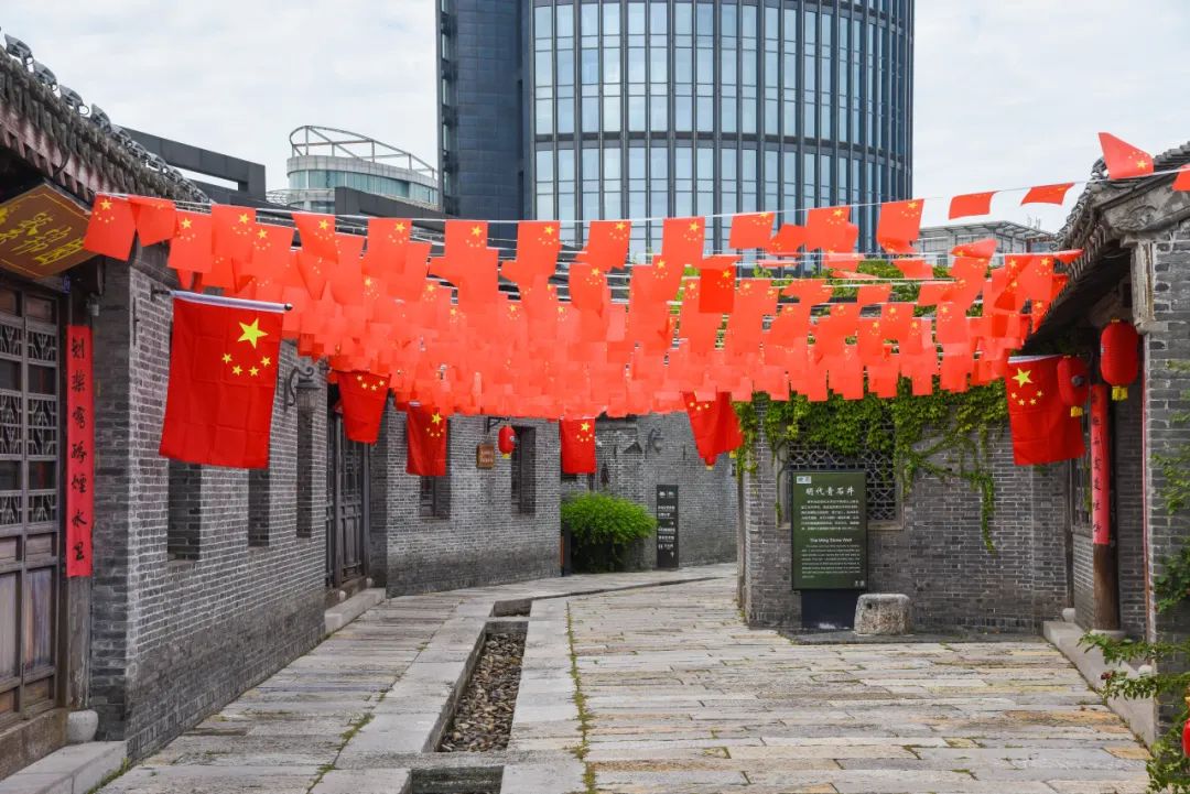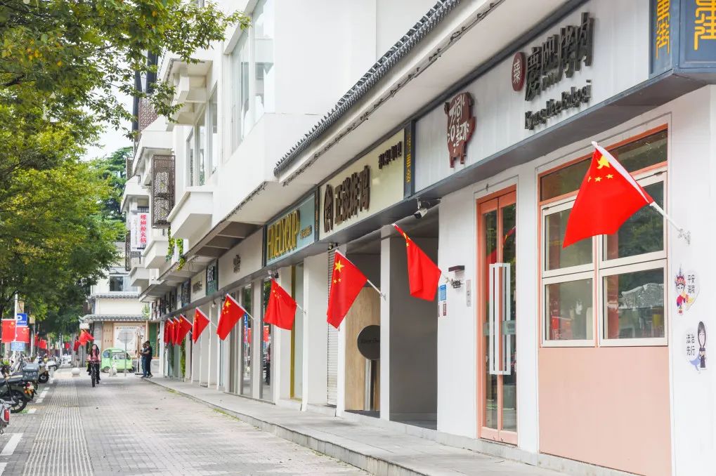 沿街商铺也都 悬挂着五星红旗 鲜艳的国旗与城市烟火气息相融合 泰州这座城市 正充满无限生机