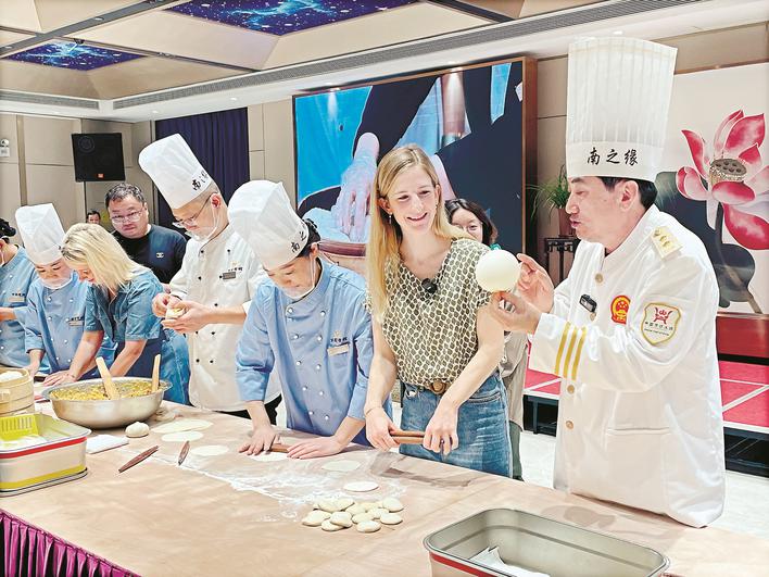 来到一座城市,先从“吃”开始。“靖江蟹黄汤包的特点是皮薄、馅多、汤多、蟹肉多……”14日早上,在靖江市南园宾馆,省级非遗蟹黄汤包制作技艺代表性传承人陶晋良,向记者团介绍并示范制作方法。奥地利记者饶有兴致地撸起袖子,动手体验擀皮、包馅等制作过程。“把普通面皮吹成‘气球’,再制作成汤包,感觉太奇妙了。”奥地利《新闻报》外交新闻部副主任玛丽斯·埃德尔说。15日,奥地利记者一行品尝泰州早茶“一茶三点一面”时,同样赞叹不已,直呼“非常精细”“很美味”!