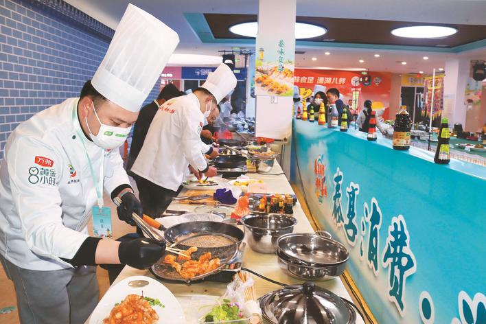 ▲名店名厨们现场烹制菜肴。 当天的泰州市姜堰区万家福广场三楼大赛现场,10个操作台一字排开,参赛厨师各显神通,煎、炒、烹、焖轮番上阵,捧出“芙蓉蟹王”“金凤出巢”“溱湖水韵”等200多道菜品。5名评委从色、香、味、形、养等方面分别打分。活动吸引众多餐饮单位和食品供应链企业负责人现场参观交流。 上海仇上明导师团队来了36人,融合“溱湖八鲜”食材,团队做出了蟹粉、珍珠、虾黄等13种狮子头,名厨谢长顺夺得导师团爆品王。70岁的仇上明从事厨师行业52年,是中国食文化专家组专家、中国烹饪艺术百佳师门仇师门掌门人及中国梅府佳宴第三代非遗传承人,他亲自烹饪了青虾狮子头请大家品尝。仇上明说,他的父亲是扬州人、母亲是泰州人,狮子头是家喻户晓的淮扬名菜,这次组团回家乡参赛,不仅是展示厨艺,更主要的是推介家乡簖蟹、青虾、莲藕、菱角等“溱湖八鲜”食材。当天,仇上明导师团获得爆品王主题赛区创意设计奖。