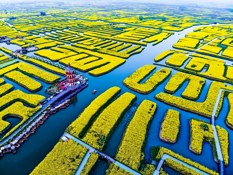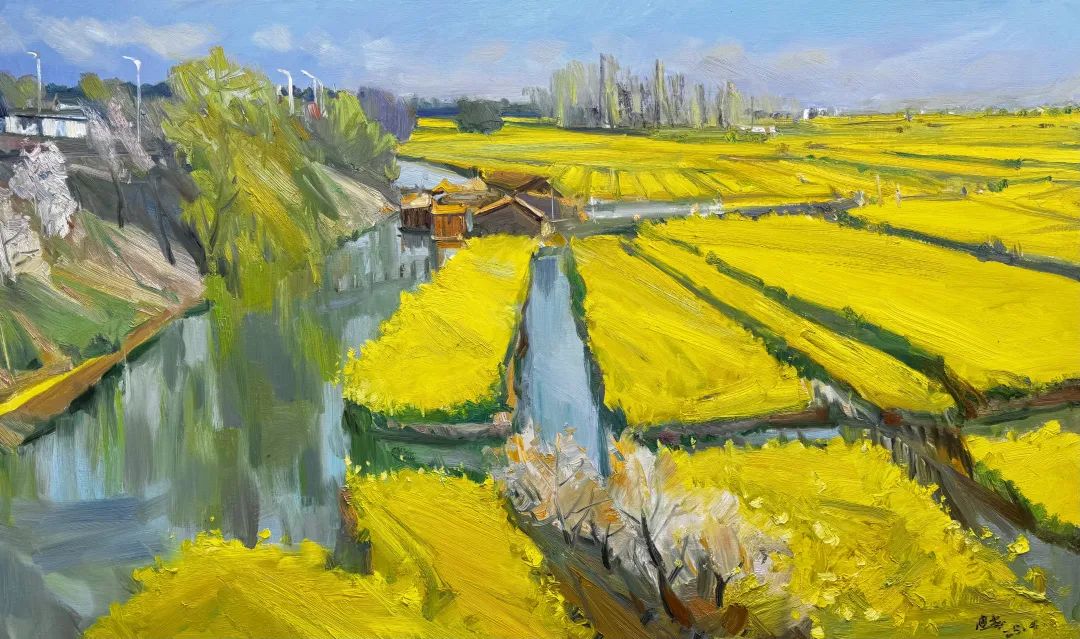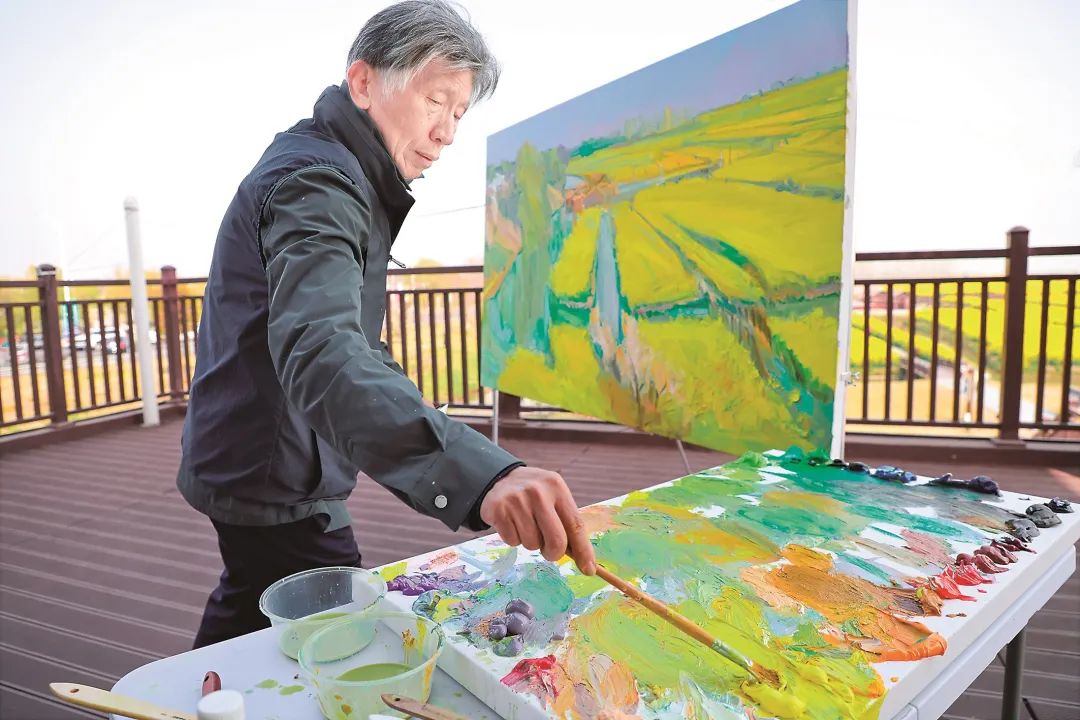 清晨的薄雾中,范迪安站在观景台上凝视远方,河道将花田切割成几何状的岛屿,远处的村落若隐若现。他抓起大号画笔,直接将一簇钛白混着中黄甩上画布,颜料如融化的阳光般炸开。在围观年轻画家们的轻声惊呼中,他又侧身蘸取青灰,用腕力推出一抹水岸的倒影,笔锋里带着中国写意的迅疾。远处白墙黛瓦的村落被他处理成朦胧的色块,与明艳的花田形成虚实相生的韵律,画布上的垛田随着他跳跃的画笔逐渐鲜活起来。
