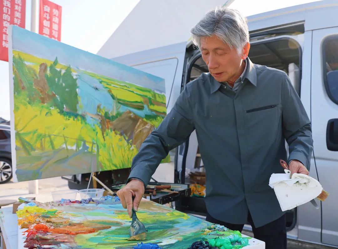 “千垛油菜花和我之前看到的油菜花都不一样,这片金色花海不仅坐拥独特的自然地貌优势,更因新农村建设中的生态保护与家园规划而形成了别具一格的景观特色。对我来说,千垛油菜花是一个新课题,今天算是试试笔,找一找表现千垛油菜花的形式和语言。”范迪安说。 范迪安时而提笔轻点,时而退后仔细端详,吸引了许多好奇的目光。“这位画家不是范迪安主席吗?我在电视上看见过他。”天津游客郝女士认出了范迪安,兴奋地和同伴低声交流。很快,周围的人群开始小声议论,有人悄悄举起手机拍照,但都默契地保持距离,生怕打扰到他的创作。 “千垛花海,范迪安2025.4画于泰州兴化。”中午12点,范迪安用画笔在画布背面签名落款,完成了整幅画作的创作,这幅2米的画作将千垛油菜的春日盛景永久定格。