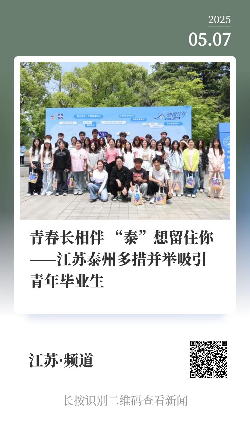 5月7日,新华社客户端刊登《青春长相伴 “泰”想留住你——江苏泰州多措并举吸引青年毕业生》一文。全文如下: