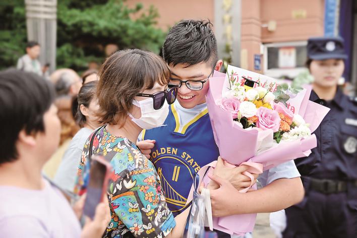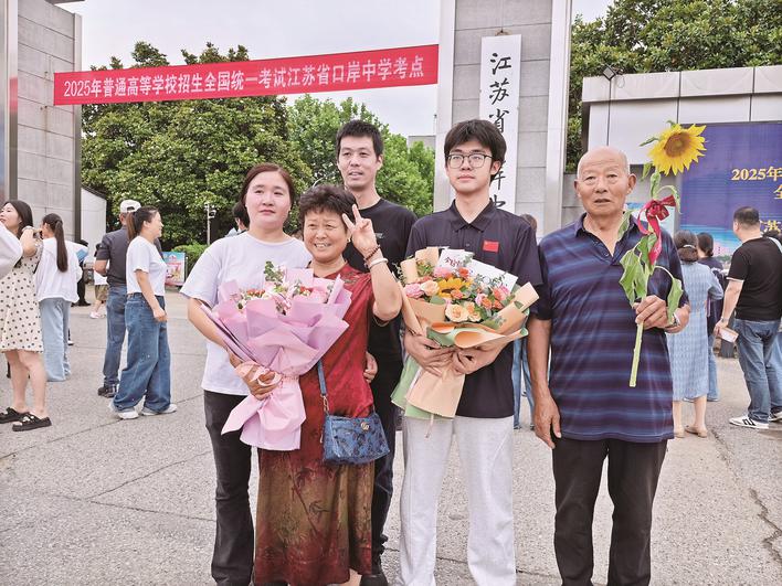“出来了,出来了!”下午3点50分,泰州二中考点外已围满前来迎接的家长。在家长们翘首以盼的目光中,考生们陆续奔出校门。拥抱、献花、微笑、掌声、祝福交织,现场沉浸在考试结束的欢乐氛围中。“这三年来,家长和孩子都很辛苦。今天全家人一起见证孩子完成高考,希望他未来的人生乘风破浪、闪耀光芒。”市民陈志伟动情地说。