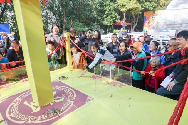 互动体验区成为现场最具人气的区域。“簖蟹爬坡擂台赛”前围满参赛家长和孩子,游客们精心挑选“蟹将军”,在阵阵加油声中见证簖蟹攀爬竞赛的乐趣。“苏超点球”赛场同样气氛热烈,游客们踊跃参与,每次命中目标都引发阵阵欢呼,同时赢得纪念品,更串联起家庭的欢乐时光。