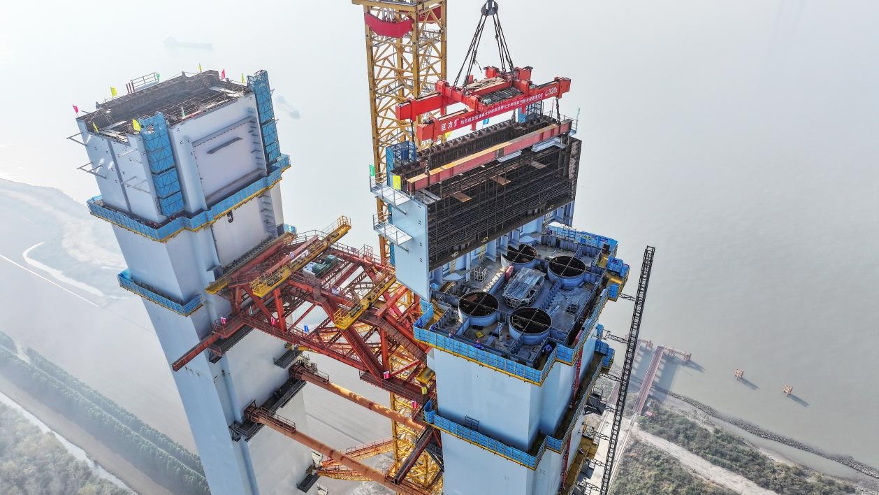 张靖皋长江大桥主跨长达2300米,在世界悬索桥建设史上尚无先例。“这么长主跨的悬索桥此前没有人建过,我们对设计方案进行了长时间的论证。”张靖皋长江大桥南航道桥北主塔一位技术负责人说。经研究,北主塔结构为世界首创的“钢箱—钢管混凝土约束组合体系”。塔柱共划分为30个节段,内嵌4根直径3.6米的巨型钢管混凝土柱。该结构可使承载力提升30%的同时,有效降低塔身自重50%,为未来2000米级以上跨径悬索桥的建设提供了“中国方案”。 张靖皋长江大桥主塔设计高度350米,为世界最高悬索桥索塔。随着北主塔塔柱节段完工,大桥北主塔建设即将转入上横梁及索鞍安装新阶段,最终将封顶至350米高度。大桥预计2028年建成通车,将把张家港至如皋的车程缩短至约20分钟,为长三角一体化发展和“八纵八横”高铁客运主通道建设注入新的动力。