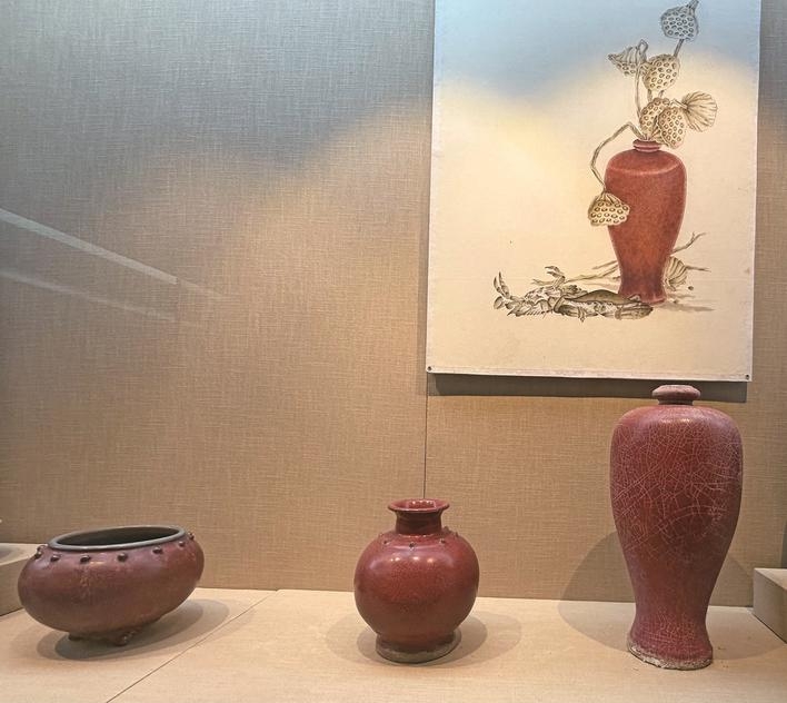 沿楼梯而上,二楼是钧窑的“色彩江湖”。来自河南禹县的钧瓷,因钧台遗址而得名,虽不见于宋代文献,却以“入窑一色,出窑万彩”的窑变奇观令世人倾倒。一尊宋代红钧梅瓶静立柜中,釉色如晚霞流淌,其间“蚯蚓走泥纹”蜿蜒生动。“这种纹路不仅是钧瓷的身份证明,更是一段火与土的艺术密语。”张影说,在这里,“家有万贯,不如钧瓷一件”不仅是民谚,更是看得见的温度与分量。 漫步于《古物大美》展区,从新石器时代至唐代的陶器、青铜器、青瓷、唐三彩错落陈列,宋代至民国的各类名窑瓷器则有序排布,共同串联起中国古代器物的发展脉络。 三楼墨香隐约,泰兴籍文史大家朱东润的题诗真迹悬于素壁。“东风吹雨小寒生,杨柳飞花乱晚晴”“软红香土君休羡,千树桃花满意春”——诗句清雅,笔意超然,为这座以物观史的博物馆平添一缕人文烟雨。这里亦是博物馆的精品馆,玉器等珍品与书画交相辉映,更有南京师范大学美术学院陆越子教授专为馆藏瓷器创作的国画陈列其间,让古物之美在艺术创作中焕发生机。