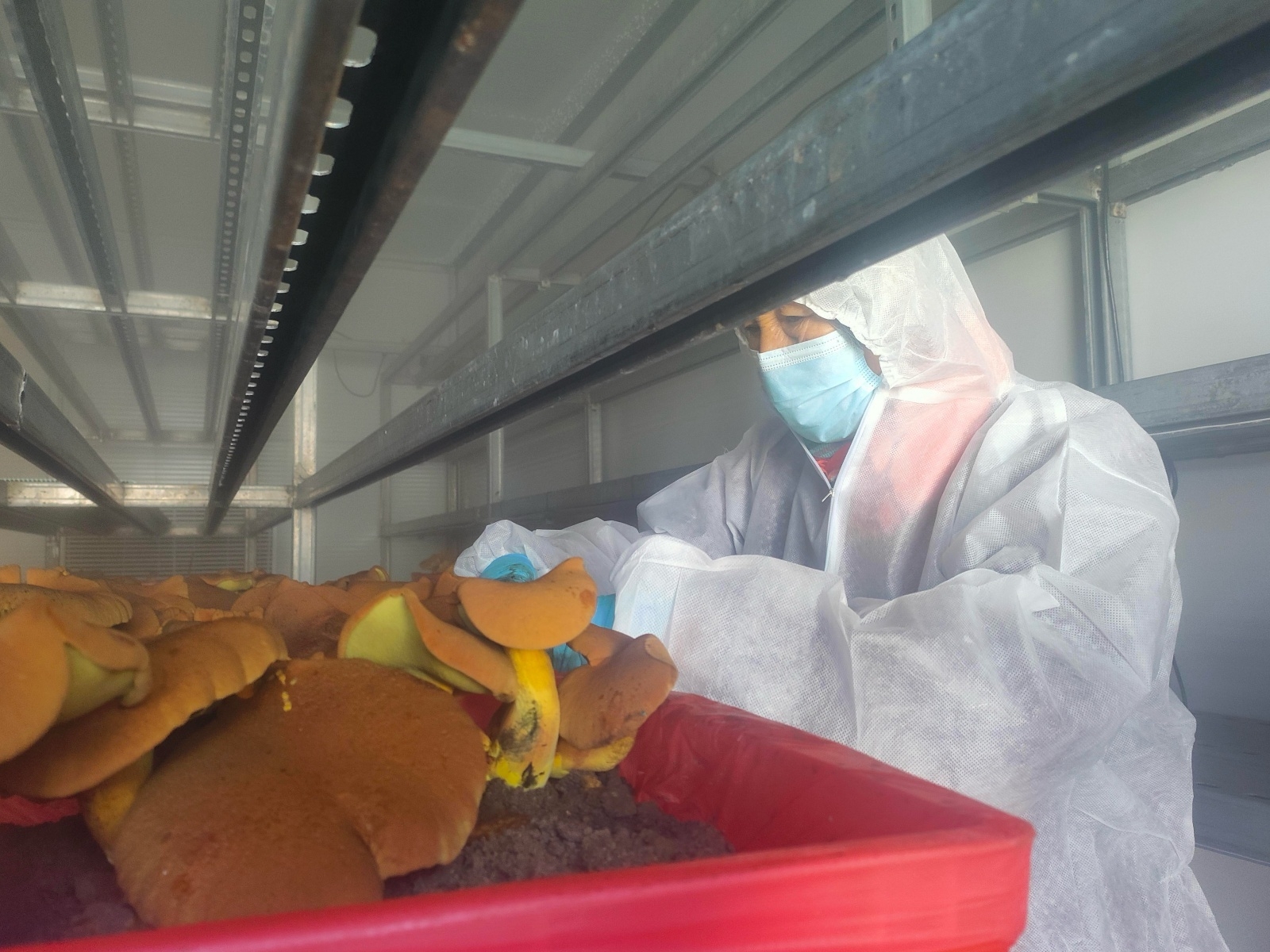 工人们装备严谨——连体防护服、口罩、手套穿戴齐整。动作轻缓而娴熟:一手稳住培育盆边缘,另一手精准捏住牛肝菌菌柄基部,手腕轻旋,一朵伞盖饱满、菌肉厚实的牛肝菌便被完整采下,整个过程轻柔如对待珍宝。