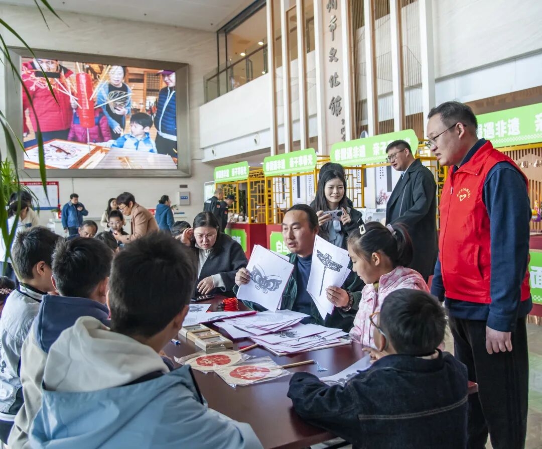 如果说景区带来的是感官的欢愉,那么文博场馆则让孩子们静下心来,用双手触摸传统。泰州市文化馆西大厅里,兴化剪纸、白马糖塑、海陵烙画等非遗摊位被围得水泄不通。白马糖塑摊前最是热闹,温热柔软的糖稀在非遗传承人手中,转眼间变成各种活灵活现的小动物。李恪謇小朋友挤到最前面,认真地说:“老师,今年是我的本命年,我想要一匹马。”拿到糖画后,他小心翼翼地举着,舍不得咬一口。这两天,博物馆、图书馆、靖江孤山泥狗子非遗文化馆内,漂漆扇、绘纸鸢、捏泥狗子等非遗体验活动同样人气高涨。
