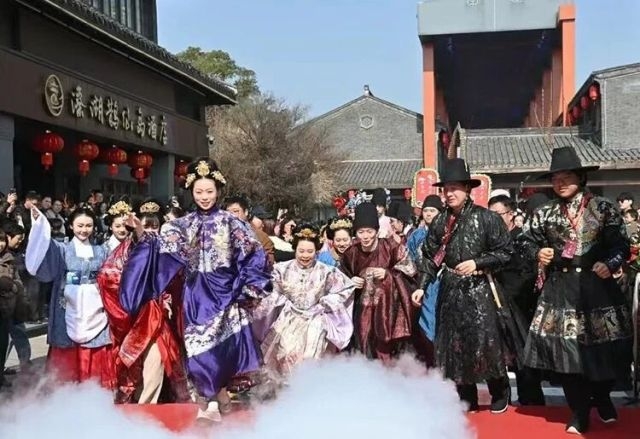 近年来,姜堰区依托“鹊桥相会”传说和里下河水乡婚俗,在鹊仙岛甜蜜街区打造婚姻登记点,集结婚登记、温馨颁证、婚俗宣传于一体,已为百余对新人提供特色化服务。假日里每天都上演“婚俗实景秀”:行进式迎亲、比武招亲、抛绣球、鱼灯巡游、水上火壶非遗表演……游客“入戏”当观众,或随机成“送亲友”。夜幕降临时,水云楼前璀璨烟花映湖面,游客仿佛穿越千年,成为传说人物,一条龙拉满“甜蜜指数”。