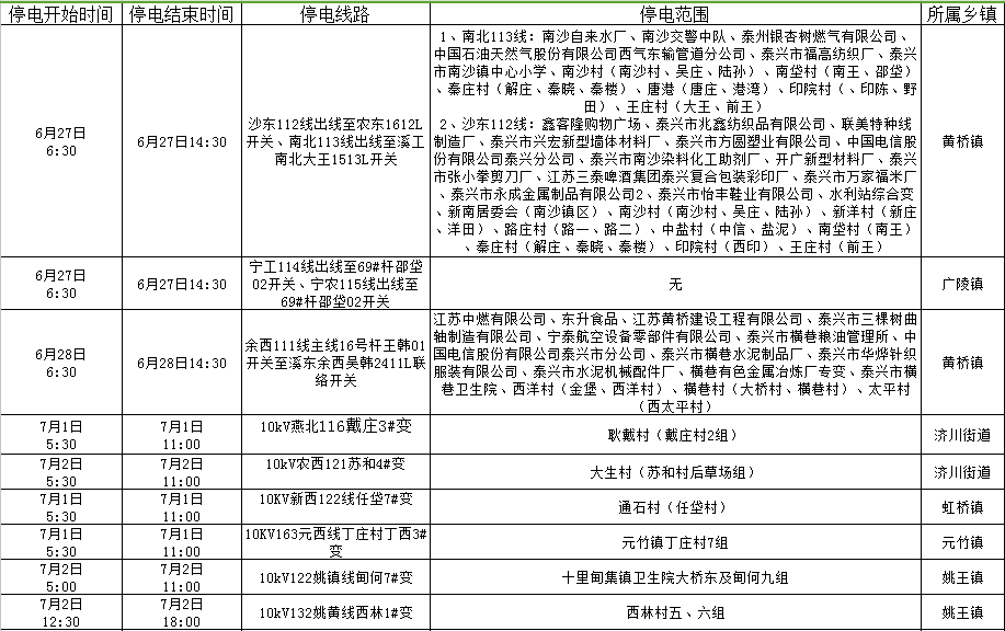 停电公告(06月26日-07月02日)