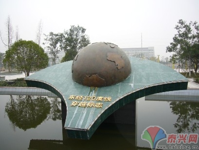 自广场中心起由北向南穿插以蓝色轴线——水轴。水轴是整个广场的中轴线,其间水流潺潺,并设有喷泉,其中北段轴线宽展,水势平缓;南段轴线修长,水流湍急。水轴中部建一东经120°经线穿越标志雕塑,泰兴是中国为数极少的主城区穿越东经120°线的城市。雕塑凸显了泰兴独特的地理位置,为城市又增添一枚名片。轴线两侧,分别栽植红花继木3株。这6只红花继木球直径2米,均为独杆,较为罕见。水轴的南端放大为滨水广场,作为轴线的结点和新的观赏空间的起点。