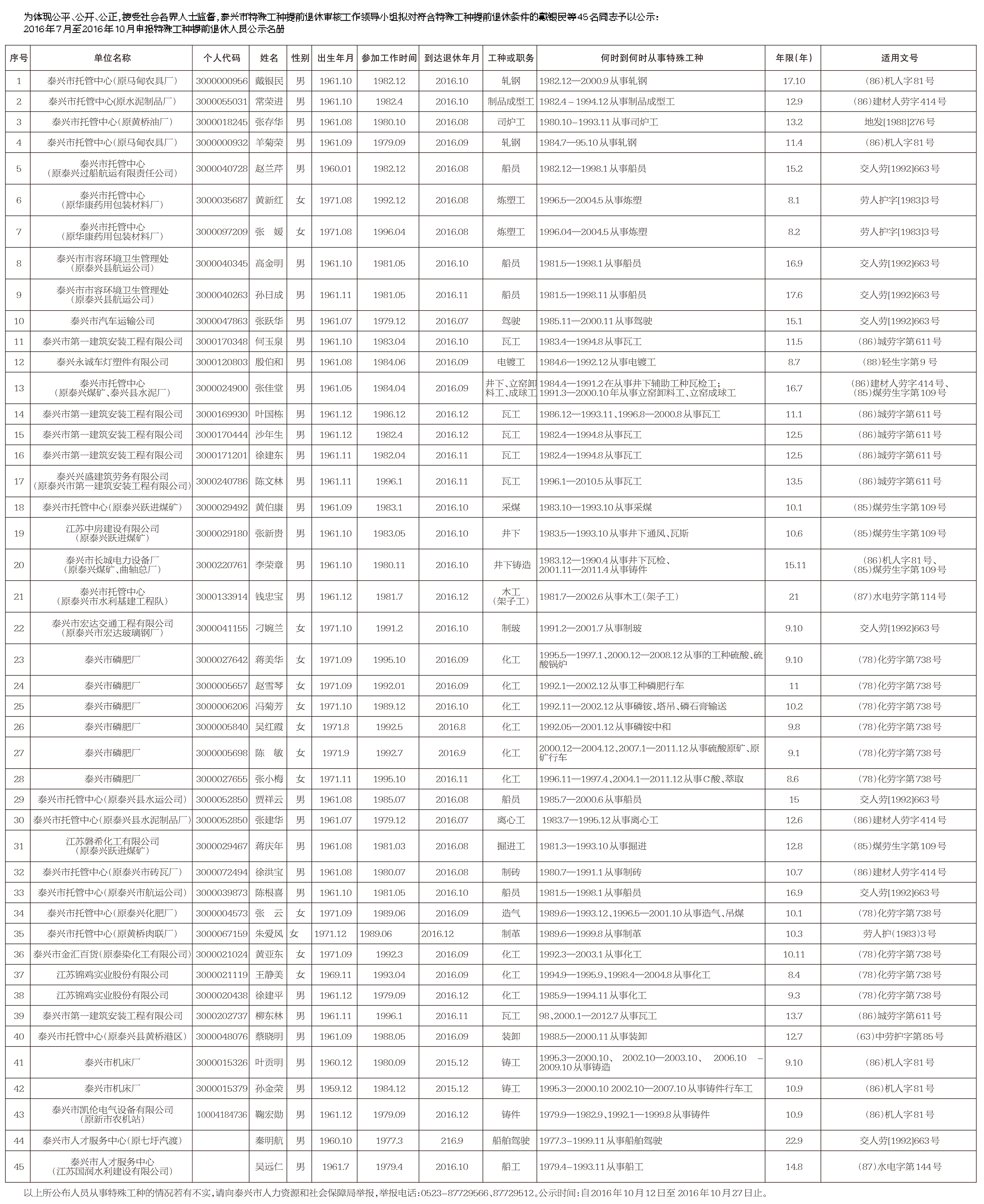 泰兴市企事业单位从事特殊工种提前退休人员公示表