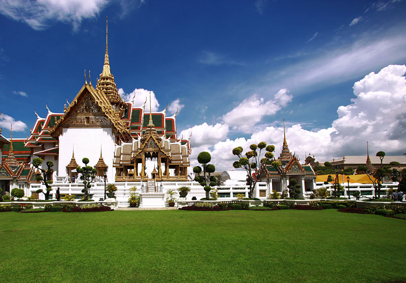 【大皇宫】(又名大王宫),位于曼谷市中心,紧靠湄南河,是曼谷王朝的象征,是旅游者去泰国的首选之地。紧偎湄南河,由一组布局错落的建筑群组成,是暹逻式风格,汇集了泰国绘画、雕刻和装饰艺术的精华。它有点像中国的故宫一样,是泰国曼谷王朝一世至八世的王宫,是历代王宫保存最完美、最壮观、规模最大、最有民族特色的王宫,现仍用于举行加冕典礼、宫廷庆祝等仪式活动。 来大王宫能看到的最有意思的场景就是很多游客都和身穿白色礼服的王家卫队的卫兵合影留念,对方非常友善。如果碰巧,说不定你还能看到王家仪仗队巡礼仪式。