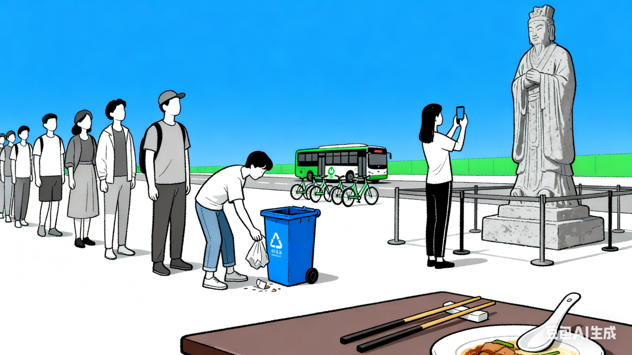 文明守公约:自觉遵守《中国公民文明旅游公约》,尊重当地风俗民情与宗教信仰,爱护生态环境和文物古迹,就餐时倡导使用公筷公勺,按需取餐,践行绿色低碳出游方式。