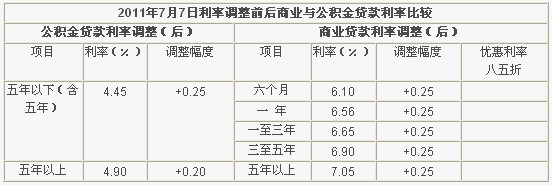 2011年7月7日利率调整前后商业与公积金贷款利率比较