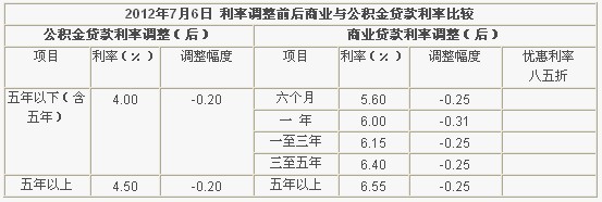 2012年7月6日利率调整前后商业与公积金贷款利率比较