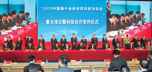 (记者 张宏伟 蒋凯 高卉妍)9月16日上午,2013年中国泰兴金秋经贸科技洽谈会举行重大项目签约仪式。现场没有鲜花和彩旗,双方代表在一张简易的长条桌前,分三批签约重大项目和科技合作项目24个,投资总额75.92亿元,协议利用外资3.08亿美元。泰州市副市长杨杰和我市领导孙耀灿、张育林、孙云、李仁国、钱娟、刘荣华、田之本、丁斌、陈岷、黄红旗、张国祥、耿元进、戴仁泉共同见证项目签约。 据了解,前一阶段,各园区、乡镇(街道)与境内外企业(客商)共达成产业投资合作协议33项,投资总额118.25亿元。其中世界500强企业、中央企业和上市企业投资项目4个,总投资42.9亿元;外商投资项目9个,协议利用外资6.48亿美元。昨天签约的24个项目中,工业项目11个,总投资62.2亿元;服务业项目3个,总投资8.22亿元;现代农业项目2个,总投资5.5亿元;科技合作项目8个。 市委副书记孙云说,我市正处在由基本小康向全面小康提升,由学赶苏南向融入苏南迈进的关键阶段,保持投资平稳增长,重大项目建设至关重要。希望签约双方本着互利共赢、共同发展的精神,坚持一诺千金和务实合作,加快项目落户,推动协议项目转化为实施项目。各园区、乡镇(街道)和市有关部门要协调联动、提升效能,强化保障、优化服务,不断强化推进重大项目建设的工作合力和宽松环境,让这次签约的重大项目和科技合作项目结出累累硕果。 |