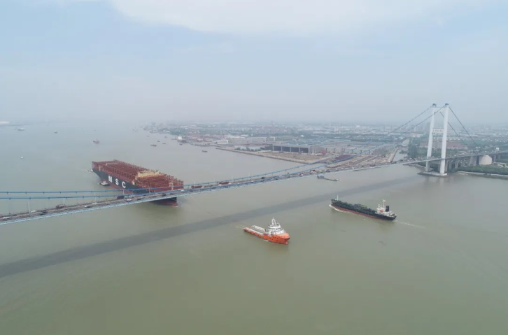24000TEU级集装箱船是目前全球载重量最大、装箱量最大的新一代超大型集装箱船型,船长399.99米,宽61.3米,甲板面积达2.4万平方米,最大堆箱层数25层。本次“鑫福108”轮采用“两吊四绑”的方式拖带出江,拖带编队长度740米、宽度82米,长江江苏段拖带里程达125公里。
