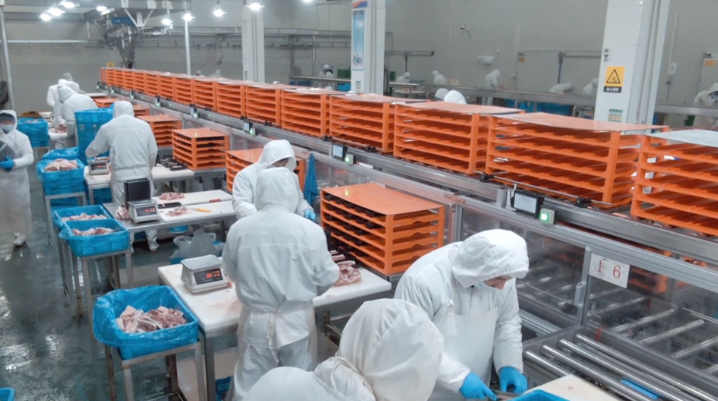 4月5日,在江苏百汇农业发展有限公司,精细化生猪分割生产设备正在作业。在加工车间,公司副总经理白开荣边走边介绍,企业独立自主研发了惠多拉智能精选中心,先后获得了11项专利。可以让每一位消费者知道产品所有的详细信息,既保证了消费者的利益,又保证了上下游企业各个端口的权益。