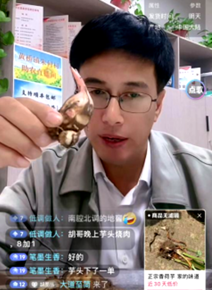 “大家好!我是泰兴市黄桥镇朱何村的一名村干部。今天,我为大家特别介绍一下我们村李奶奶刚刚送过来的新鲜农产品——香荷芋和扁豆,它们都是纯天然的绿色生态农产品。欢迎大家根据自己的需求下单购买……”11月17日傍晚,在朱何村村委会大厅里,该村党总支书记、村委会主任胡建军正通过手机直播介绍农产品,时不时与网友互动。