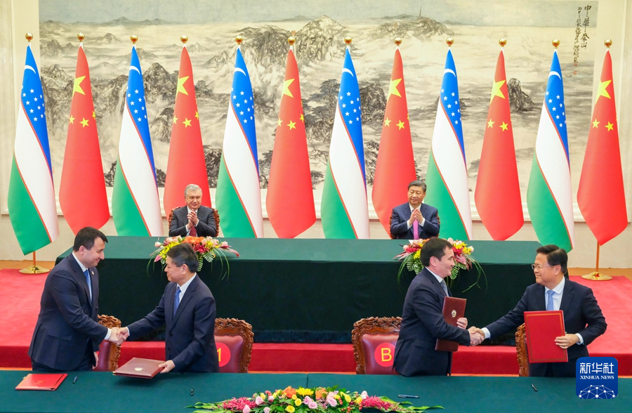 1月24日下午,国家主席习近平在北京人民大会堂同来华进行国事访问的乌兹别克斯坦总统米尔济约耶夫举行会谈。这是会谈后,两国元首共同见证签署一系列合作文件。新华社记者 丁林 摄 会谈后,两国元首签署并发表了《中华人民共和国和乌兹别克斯坦共和国关于新时代全天候全面战略伙伴关系的联合声明》,并共同见证签署共建“一带一路”、全球发展倡议、经济技术合作、互联互通、环境保护、新能源、科技、人文、农产品准入、地方等领域一系列合作文件。