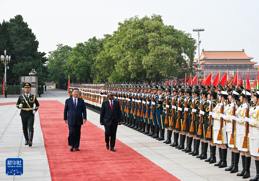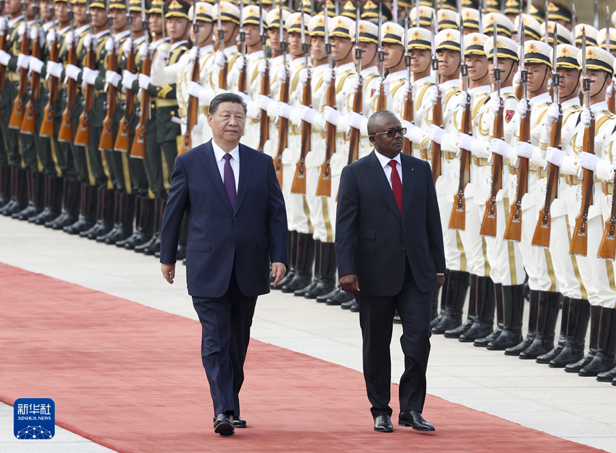 7月10日下午,国家主席习近平在北京人民大会堂同来华进行国事访问的几内亚比绍总统恩巴洛举行会谈。这是会谈前,习近平在人民大会堂东门外广场为恩巴洛举行欢迎仪式。新华社记者 饶爱民 摄 新华社北京7月10日电(记者郑明达)7月10日下午,国家主席习近平在北京人民大会堂同来华进行国事访问的几内亚比绍总统恩巴洛举行会谈。两国元首一致同意,将中国同几内亚比绍关系提升为战略伙伴关系。