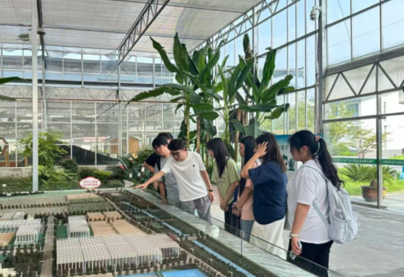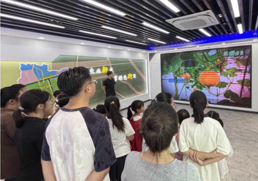 8月15日,泰兴市国家现代农业产业示范园科技孵化展厅,迎来了一批“特殊学员”——一群朝气蓬勃的大学生。展厅内,新街镇地形地貌沙盘从侧面展示了新街镇现代农业发展的壮阔历程。“今年的中央一号文件就给我们的农村农业工作指明了方向,着力壮大县域富民产业,就是要发展乡村特色产业、完善联农带农机制、拓宽农民增收渠道。”志愿者讲解员向大家解读了今年的中央一号文件精神,并讲述了新街镇现代农业发展进程,以及园区最新的种植品种和种植技术。大学生们纷纷提问,还探讨了电商模式、物流成本和品牌打造等问题,对用好“新农具”、干好“新农活”、做好“新农人”有了更生动的理解,也对“互联网+农业”的广阔前景充满期待。 在现代农业展厅的大屏幕前,孩子们和家长们一同观看了新街镇现代农业宣传片,宣传片生动展现了新街镇现代农业的崭新面貌:从传统农耕到智慧管理的飞跃。“大家看,我们的大棚里安装了各种传感器,对阳光、温度、湿度、土壤养分进行实时监测和自动调节。就像给庄稼装上了‘智能管家’,让它们在最舒适的环境里生长。”志愿者介绍道。孩子们纷纷睁大好奇的眼睛,开启现代农业的“探秘之旅”。当巨大的屏幕上出现无人机在田野上空飞翔作业、机械臂自动采摘蔬果的画面时,孩子们发出了阵阵“哇”的惊叹声。